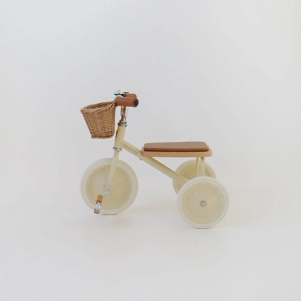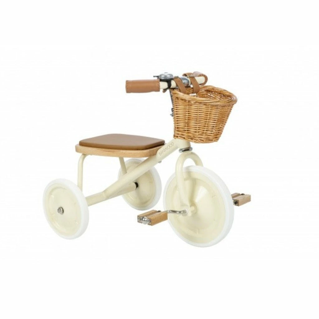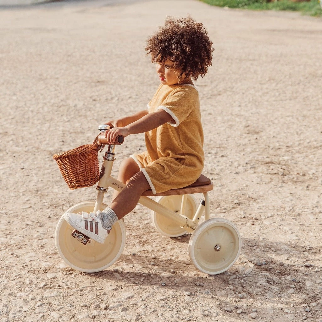 This cream balance tricycle for kids is built out of sturdy materials. The grips are made of vegan leather, easy to wipe off and the pedals and seat is made of oak wood with a soft padding for a comfy ride. The little one can bring along their favourite teddy bear or toys in the front wicker basket.