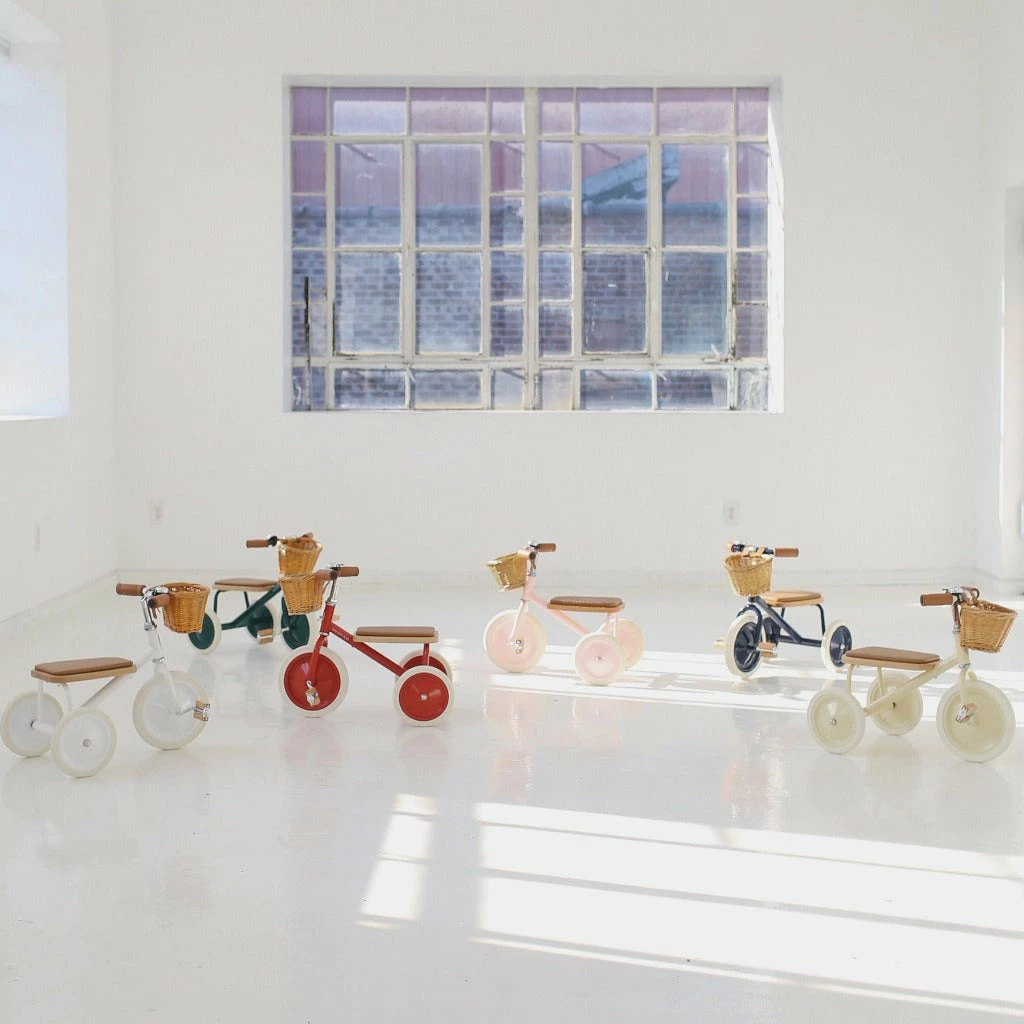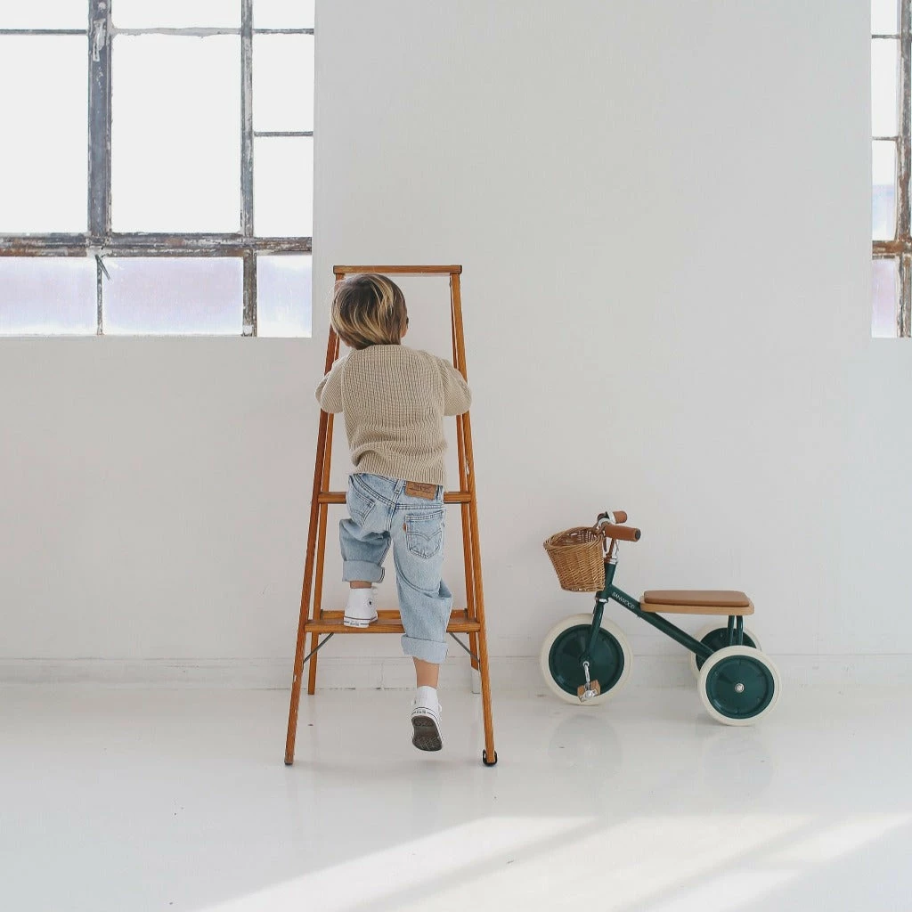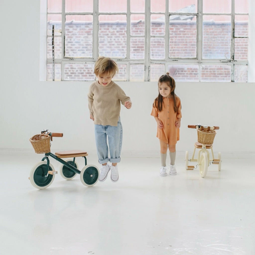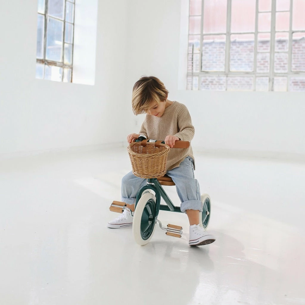 The seat of this classic tricycle is made out of oak and is softly padded for a comfortable ride. The grips are made out of vegan leather, wooden oak pedals and a removable push handle bar is attached in the back to get the smallest one started. It also comes with a wicker basket in the front – a perfect way to bring the favourite teddy bear on the ride.