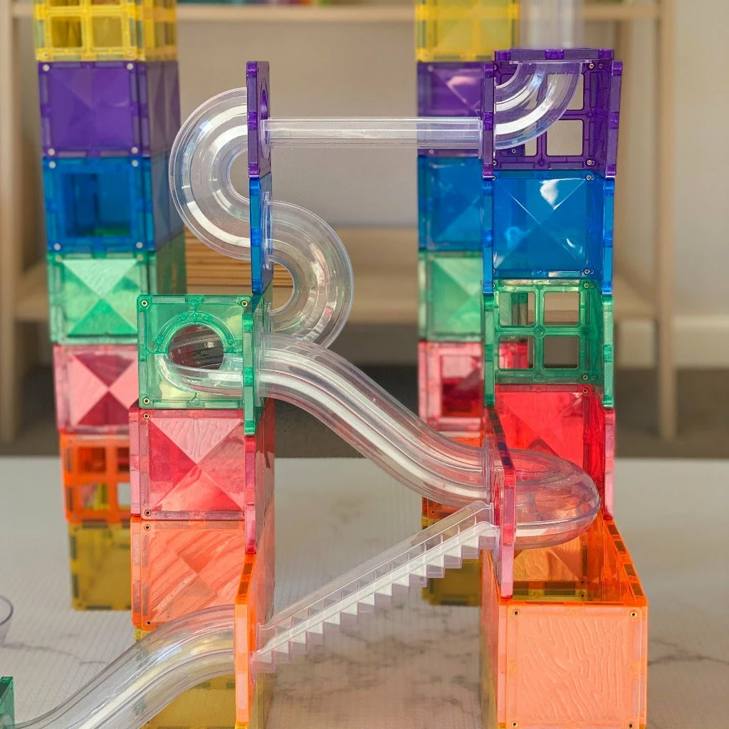 This pack features our unique exclusively designed clear fluted tubes, 6 rainbow wooden balls, x2 special effect stair soundscape tubes, x2 S-bend tubes AND a split tube for racing fun! Also including connector tiles, this is the perfect expansion pack to explore gravity and motion.