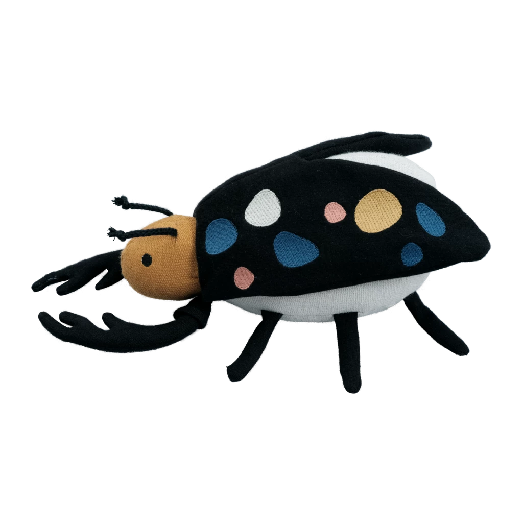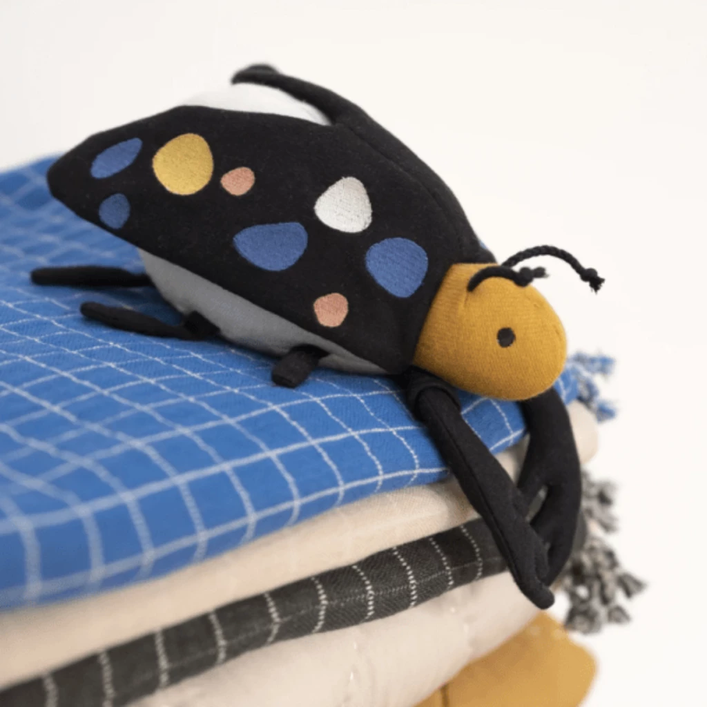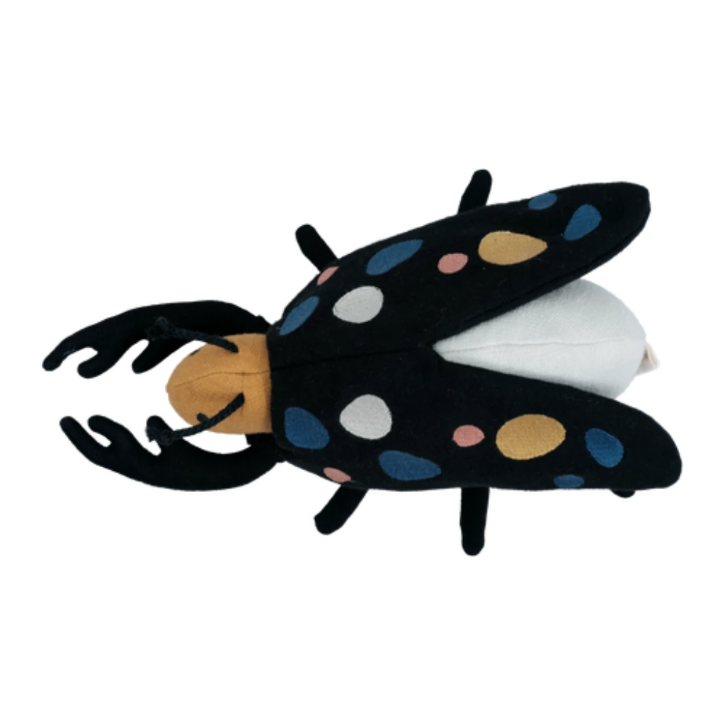 With his big body and scratchy, dotted wings, long horns and sound bell he is a true partner in crime when your curious baby wants to discover his senses through his eager hands, ears and mind!