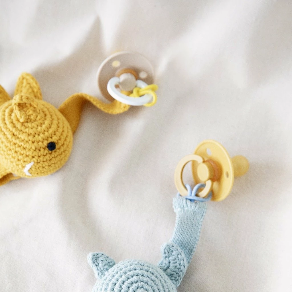 This lovely pacifier clip is 6cm long and comes with a metallic clip that can be attached to any piece of clothing.