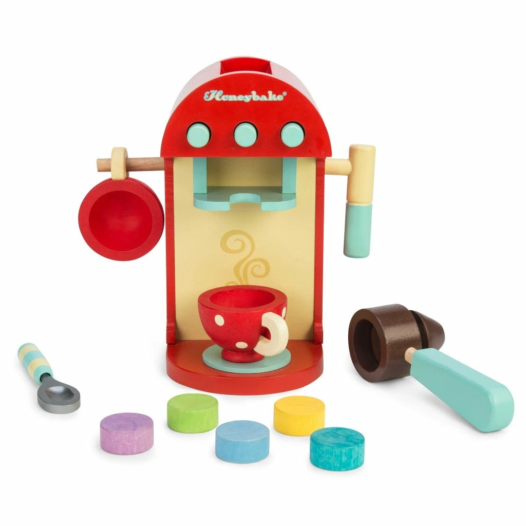 Includes colourful water based painted pods to insert in the removable filter, a ‘milk frother’, two water based painted cups and a spoon.