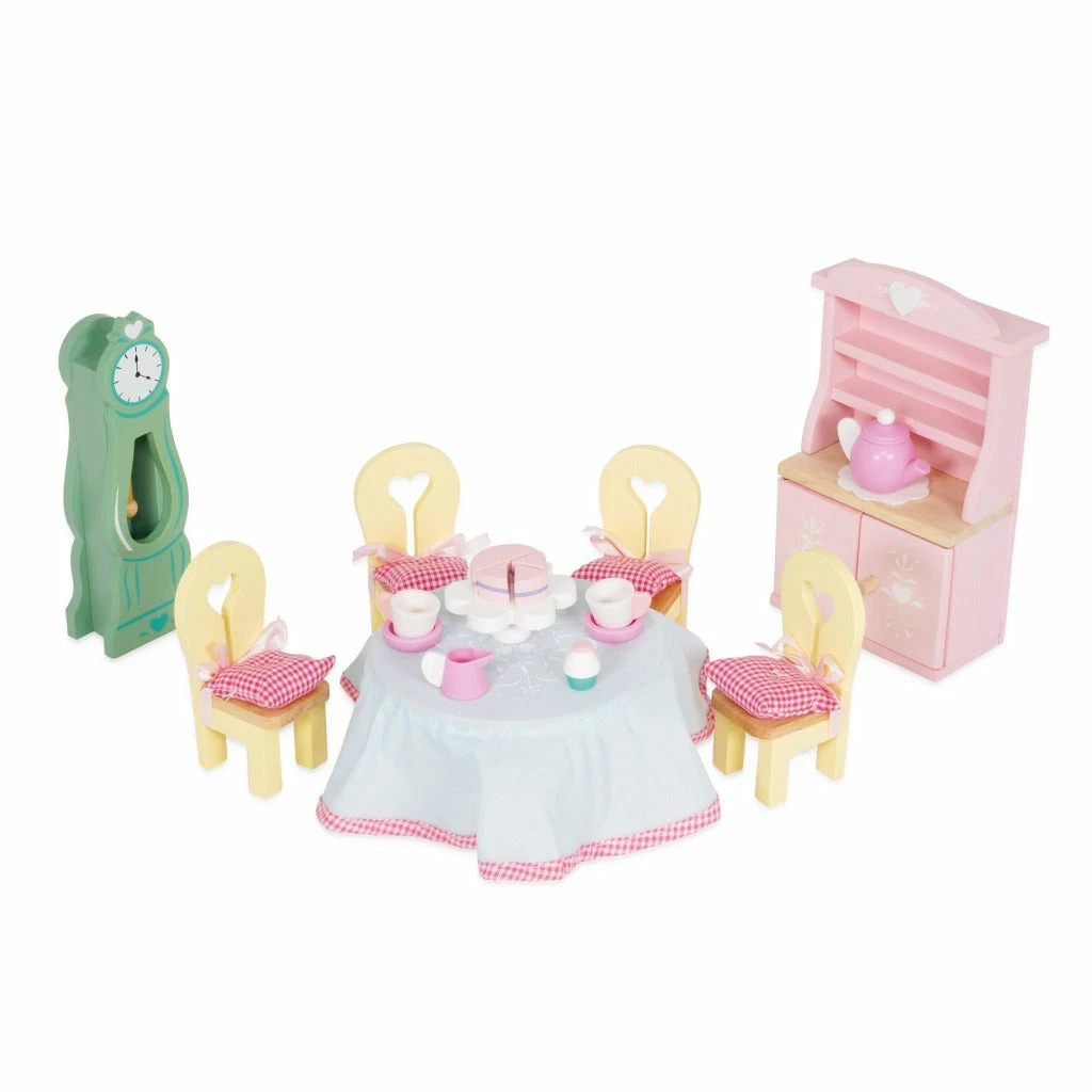 A painted wooden furniture set including a dresser, grandfather clock, dining table and 4 chairs with tie-back cushions.