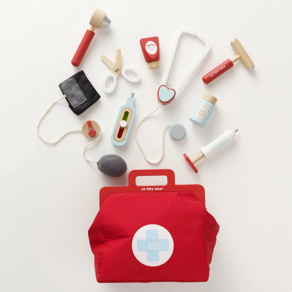 A vintage style, child sized fabric Doctor’s Medical Bag filled with wooden medical instruments and bottles.