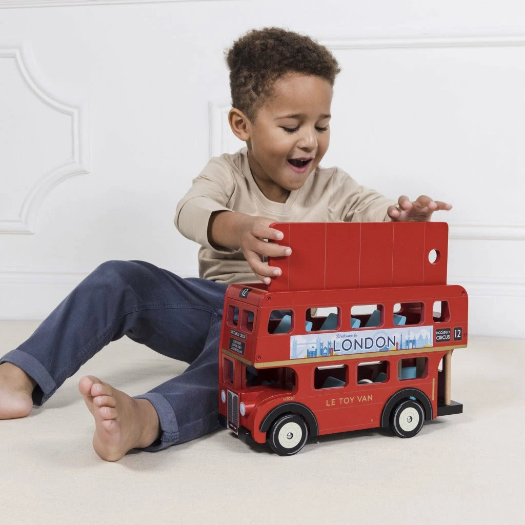 This wooden bus is brightly painted in red with London livery, and has space for 11 passengers.