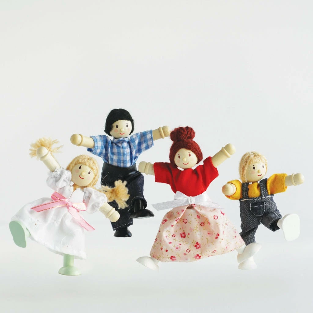 A wooden posable doll family dressed in hand finished pretty outfits.
