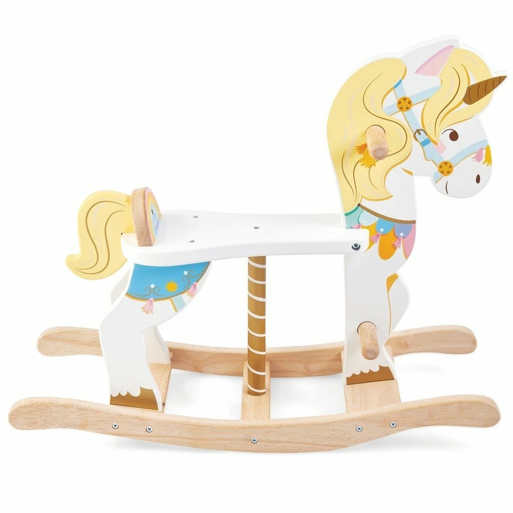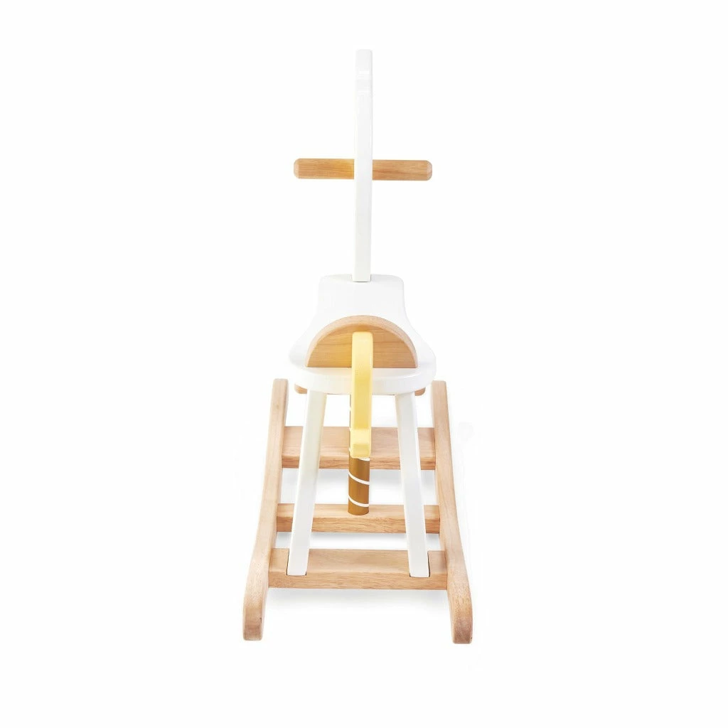 A modern & unique twist on a traditional piece. Made from smooth solid rubber wood, with beautifully shaped rockers for a great ride.