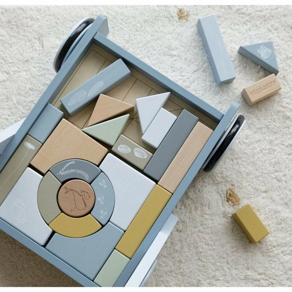 The block trolley is equipped with wooden wheels and filled with coloured wooden blocks featuring beautiful drawings from the Ocean collection such as a whale, shells and water plants. The different sizes of the blocks promotes children’s recognition of colours and shapes.