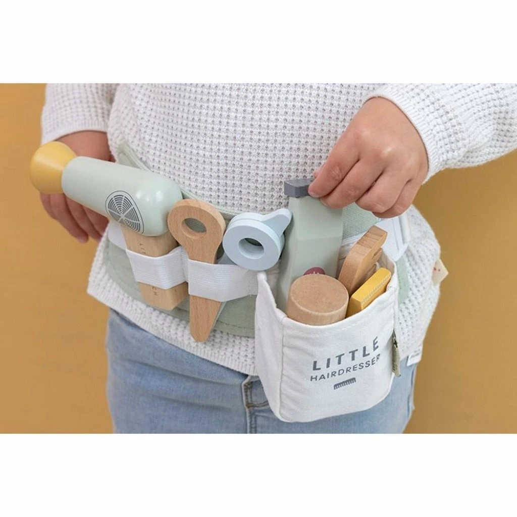 This wooden set of essentials for hairdressing, includes toy scissors, a blow dryer, a straightener, clippers, a comb, shampoo, hair spray and styling gel.