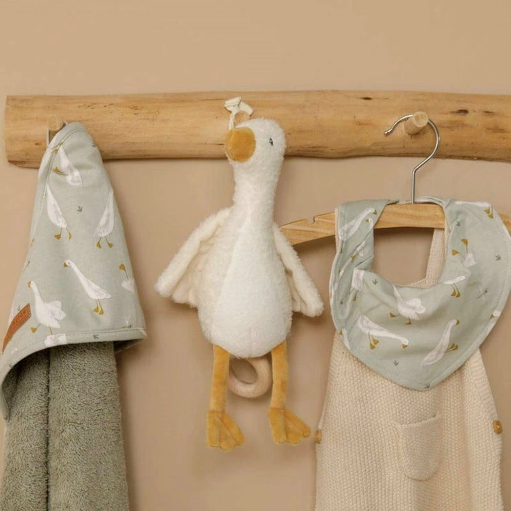 Simply pull the cord and let the music do its magic. A nice and soft decoration for the nursery with its flapping wings and dangling legs. The Little Goose music box is easy to attach to the playpen, crib or dresser.