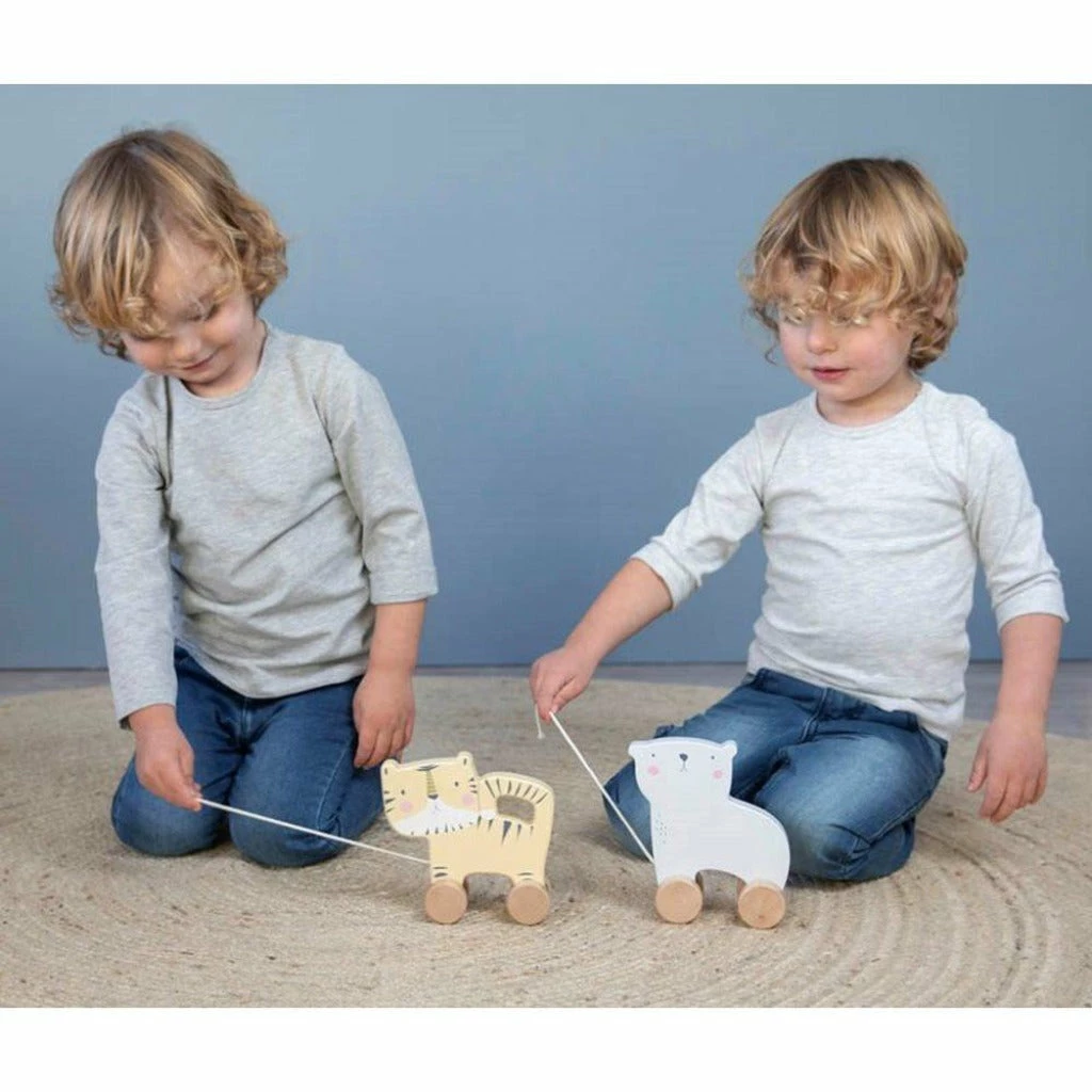 Hit the road with the Little Dutch pull along animal. Pull the rope to move the tiger forward or give it a push for extra speed.
