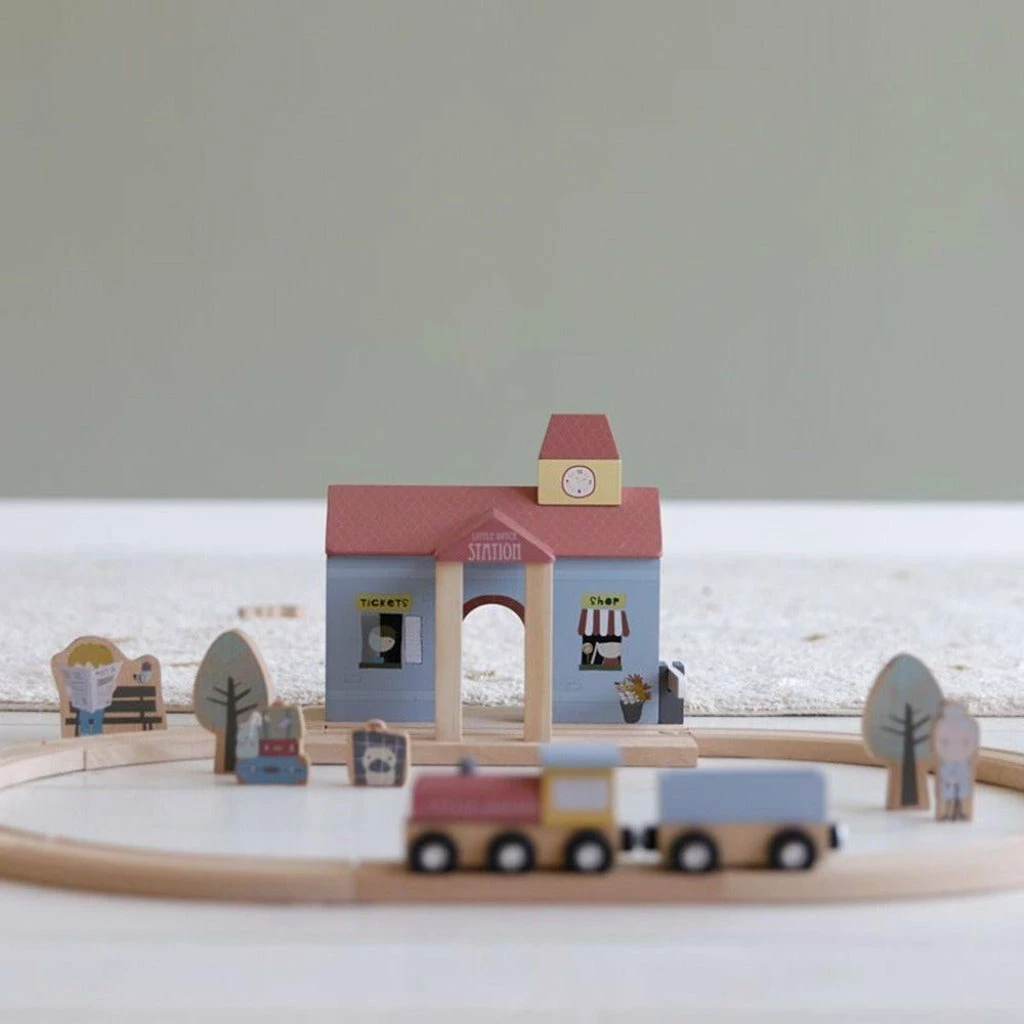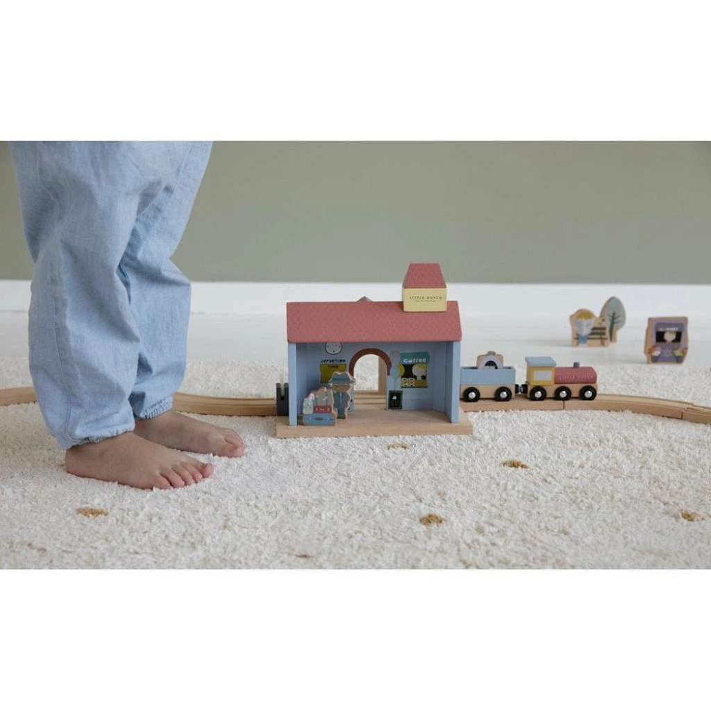 This wooden train station is one of the many playsets that can be connected to the Little Dutch railway train XXL set.