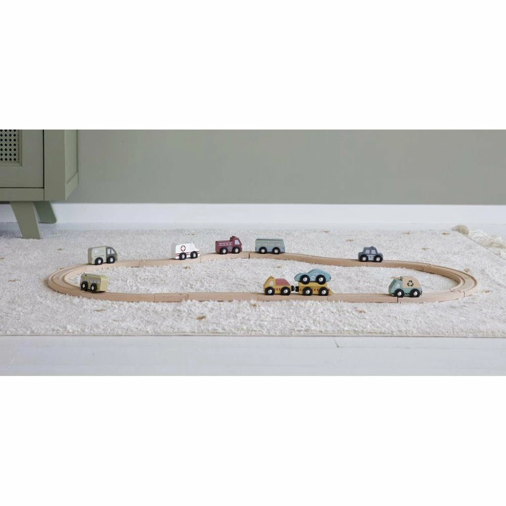 These wooden service and emergency vehicles are designed to be used in combination with the Little Dutch wooden railway train set.