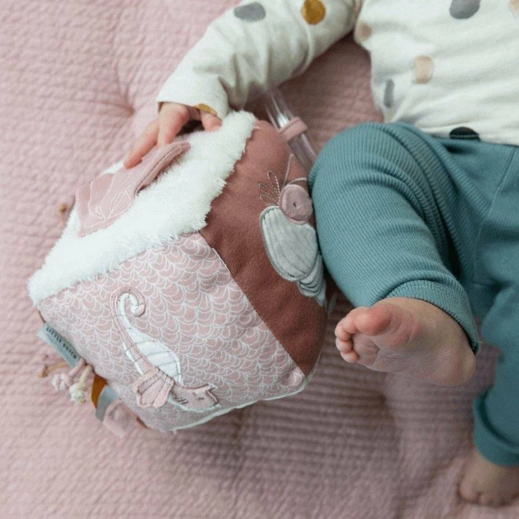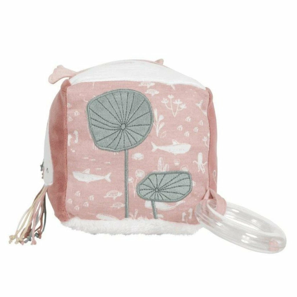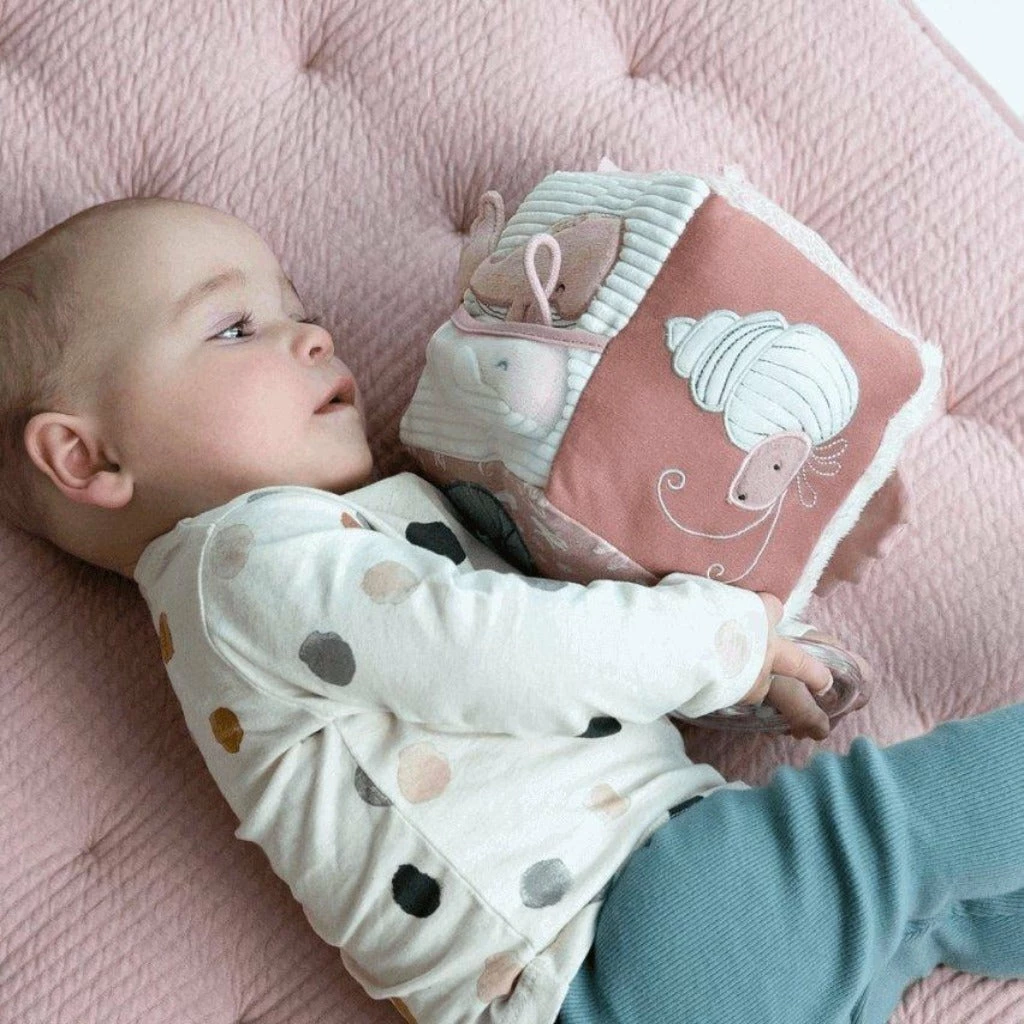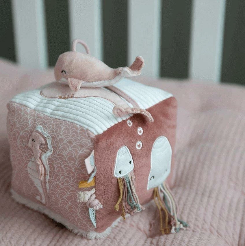 The soft activity cube from Little Dutch with underwater animals contains many activities that stimulate the senses of babies.