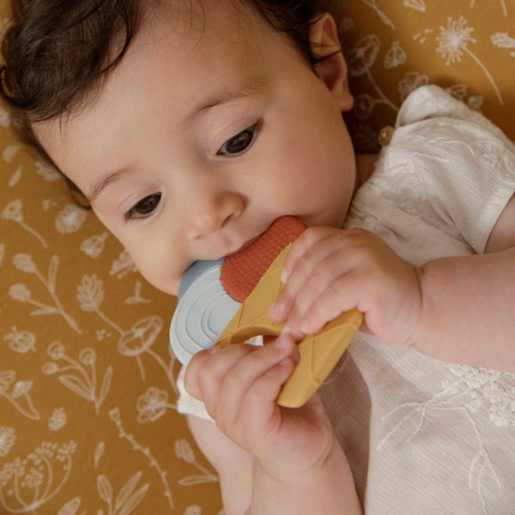 To soften the pain Little Dutch created this colourful ice cream teething ring, the teether will provide soothing comfort and helps stimulate the eruption of your baby’s new teeth.