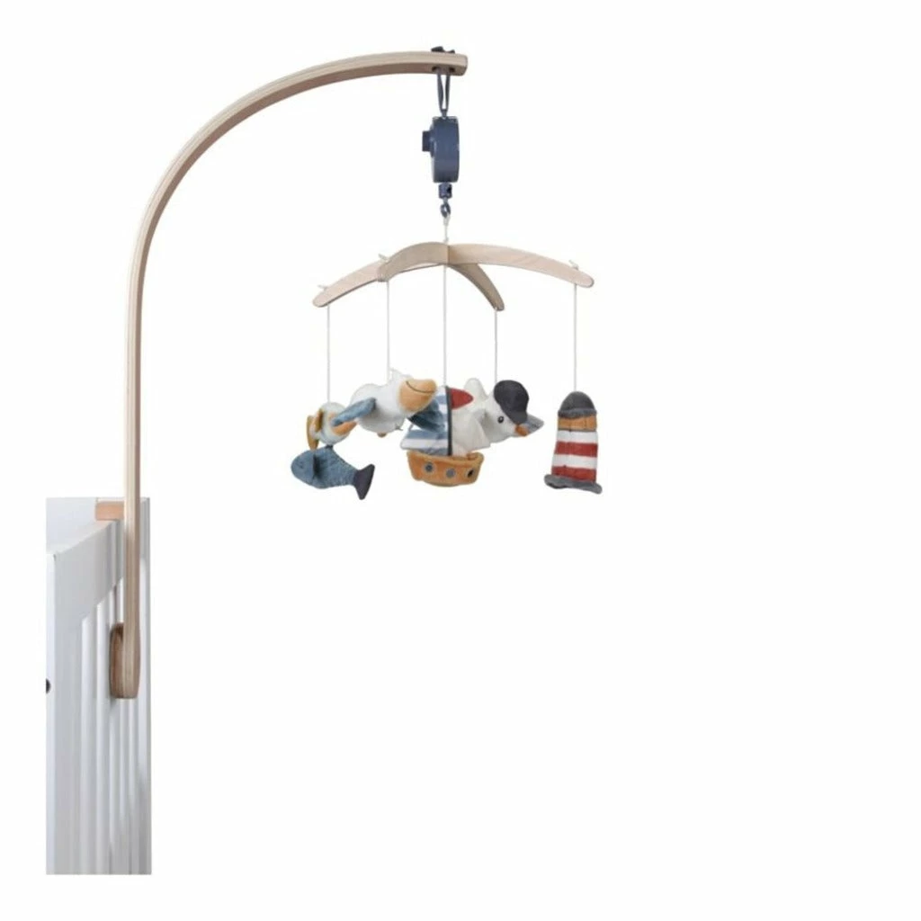 It features five different hanging toys to look at from the Sailors Bay, including seagull Jack, pelican Joe, a sailboat, a fishy duo, and a mirror lighthouse.