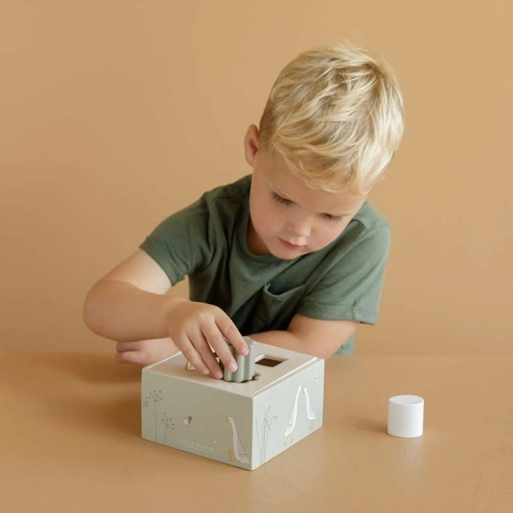 - 1 wooden shape sorter with lid, including 5 sorting blocks with animal print