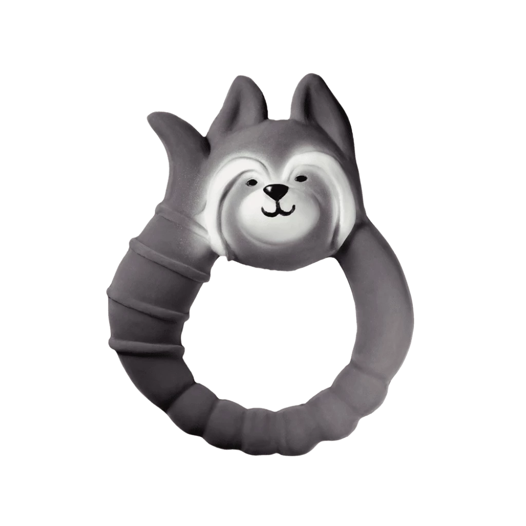 The raccoon has different surfaces for sensory play and has both soft and hard natural rubber to satisfy all stages of sore gums. The contrasting colours stimulate your child’s sight.